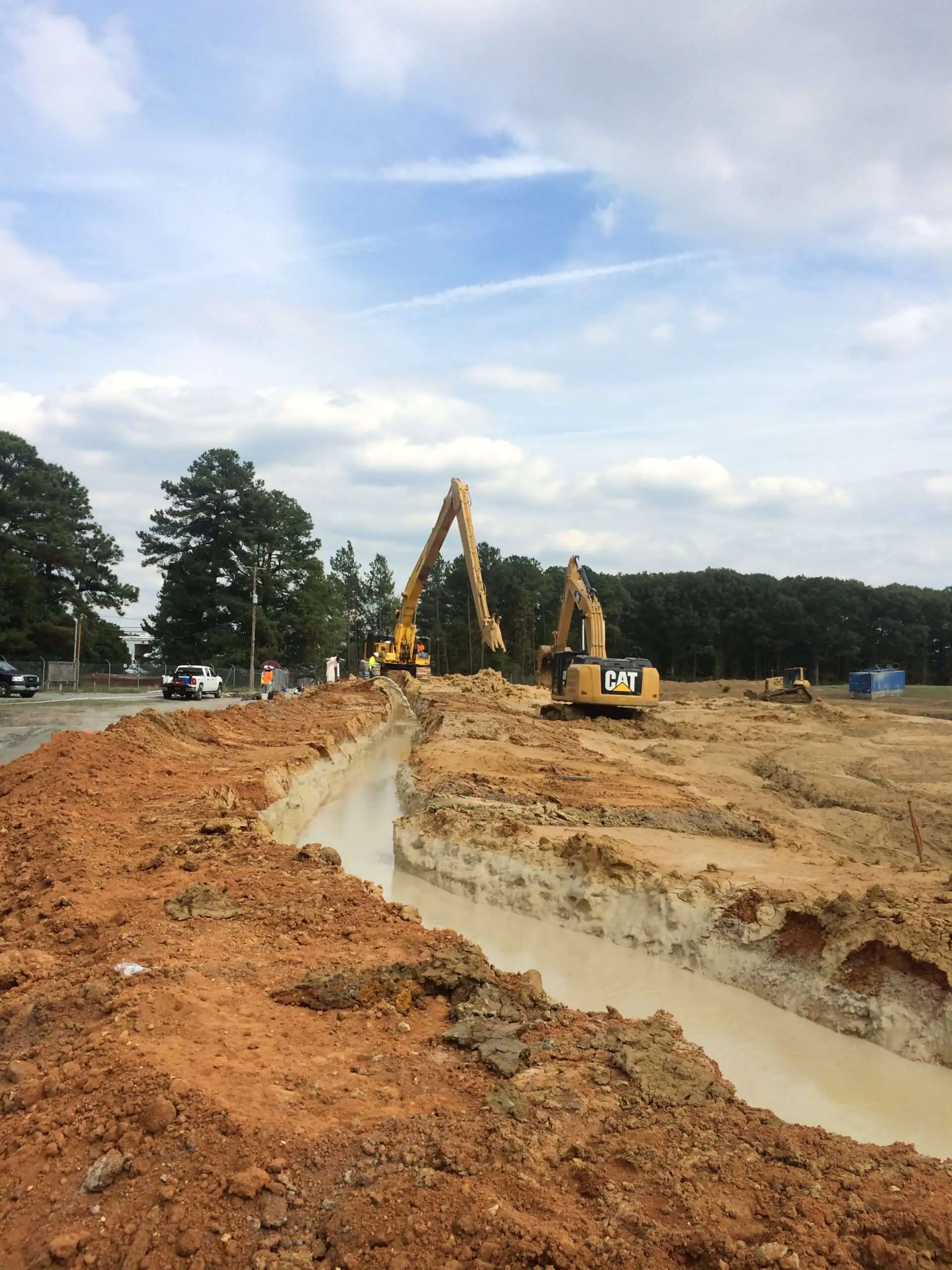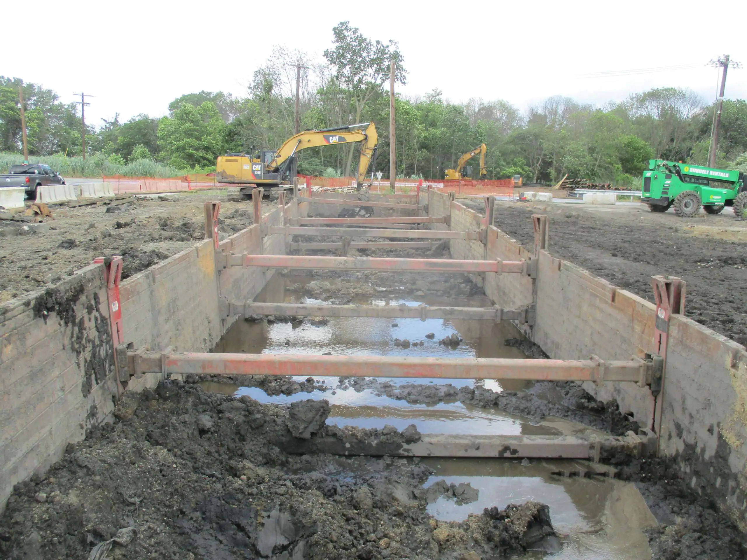 ENTACT utilizes OSHA-compliant benching, sloping, and shoring methods tailored to site-specific conditions such as soil type, excavation depth, groundwater conditions, available workspace, and the presence of nearby structures, utilities, and other infrastructure. For deeper excavations or constrained sites, engineered earth retention systems are implemented to maintain stability and protect adjacent facilities.